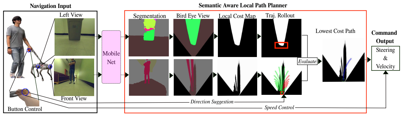 The semantic-aware local path planner utilizes segmentation masks to classify obstacles in the environment. The system considers the handler's position relative to the robot and generates collision-free paths that maintain safe distances from obstacles while following the handler's directional cues. This enables guide dog-like navigation behavior where the robot smoothly avoids obstacles while keeping the handler informed through the harness feedback.